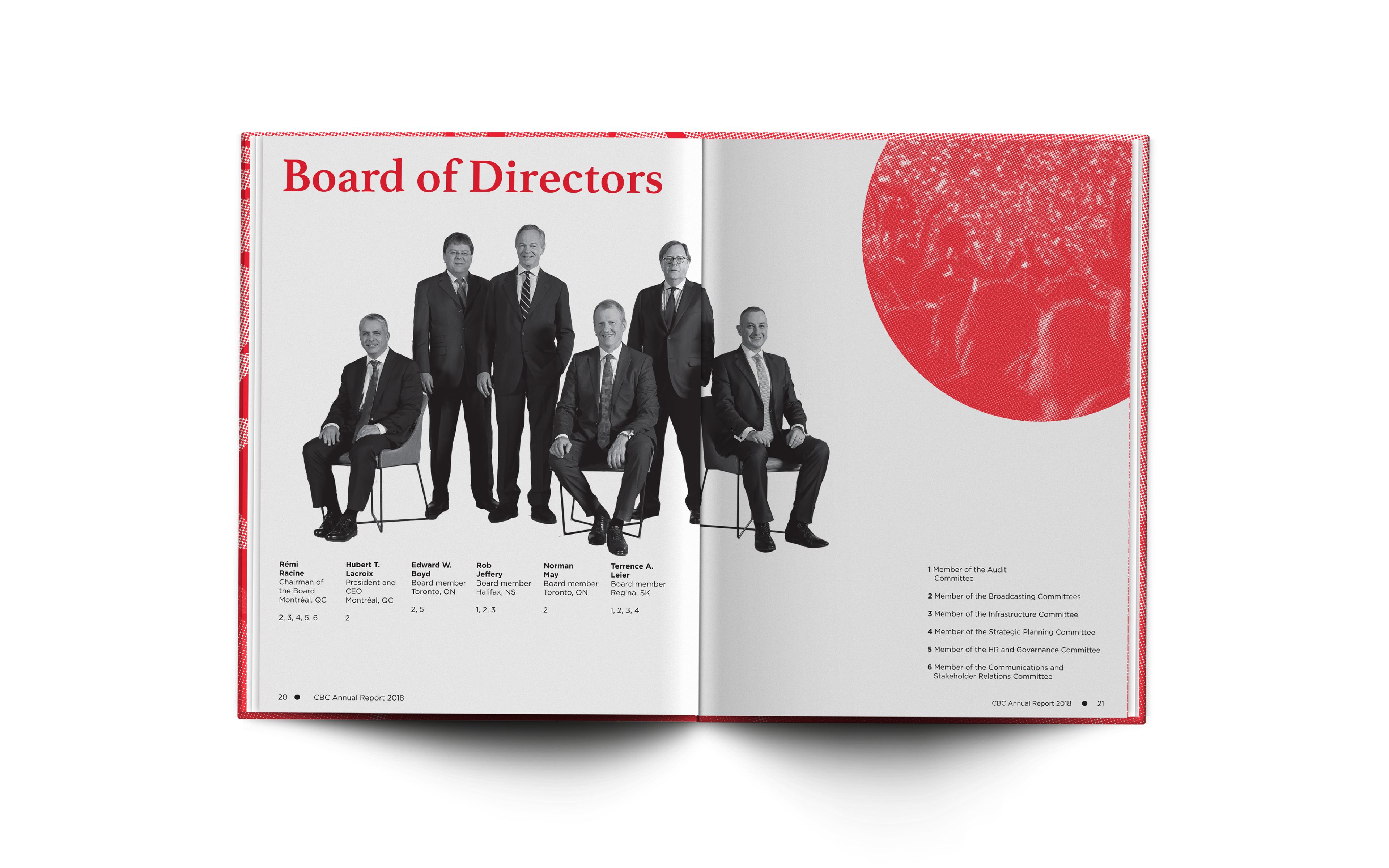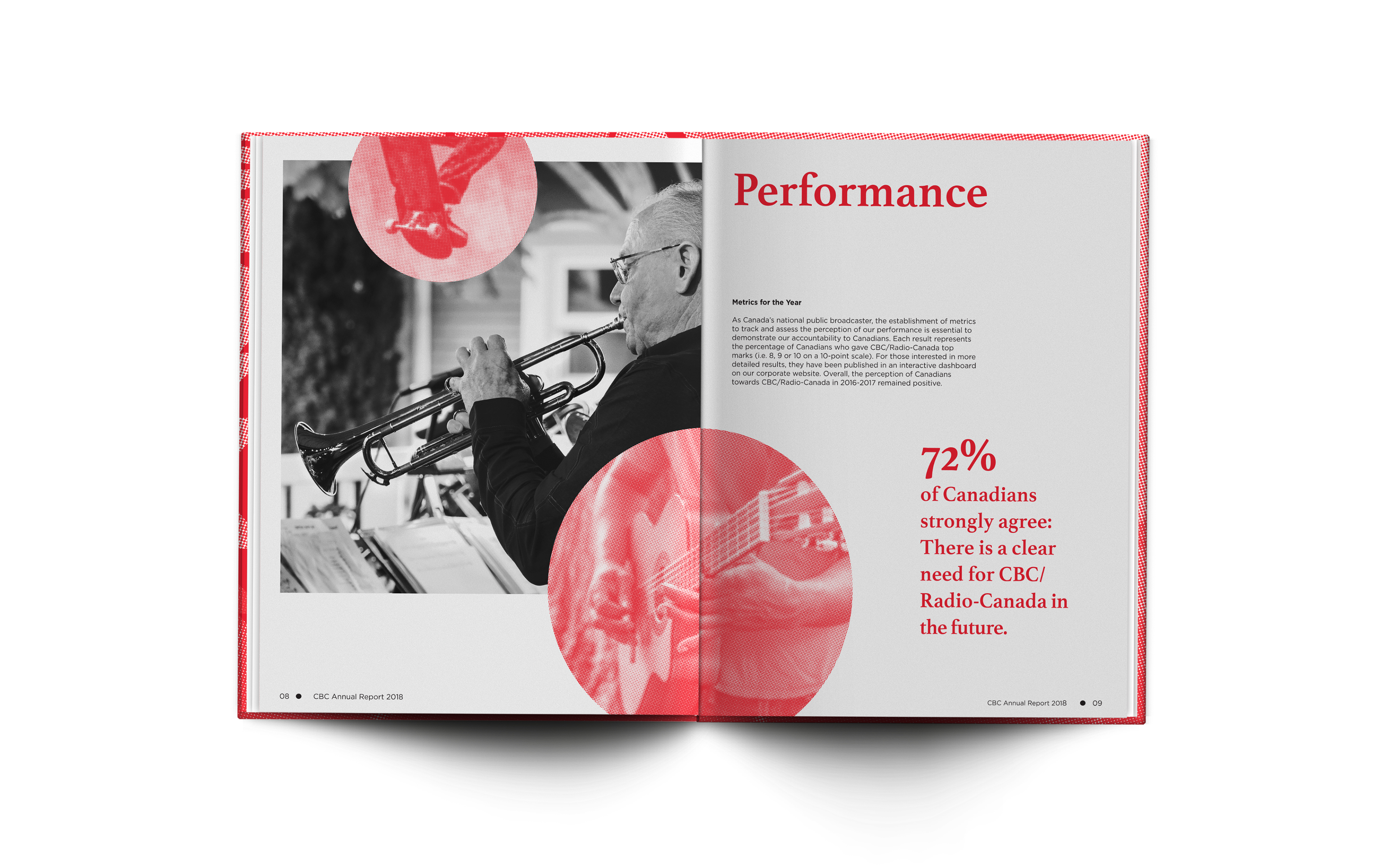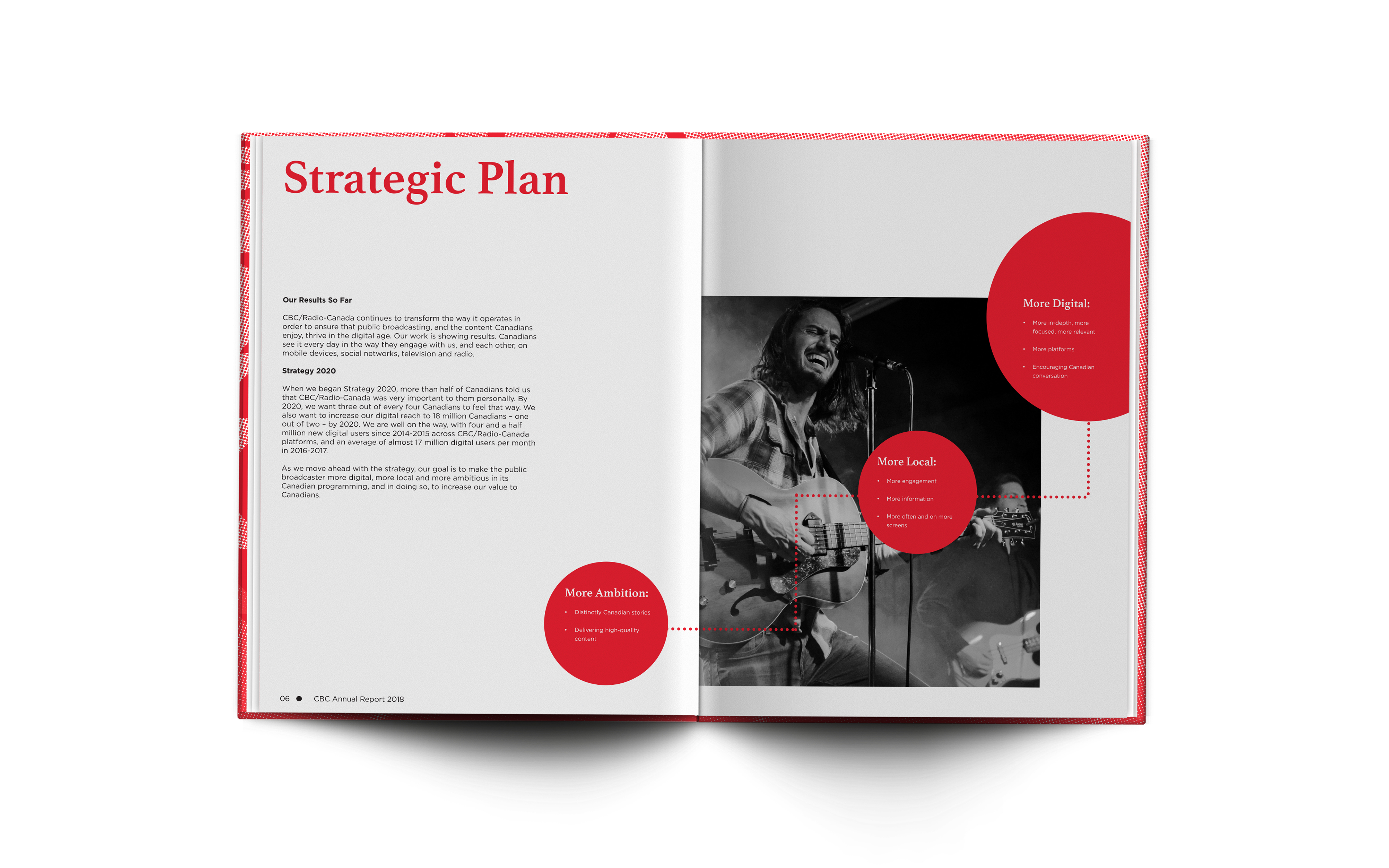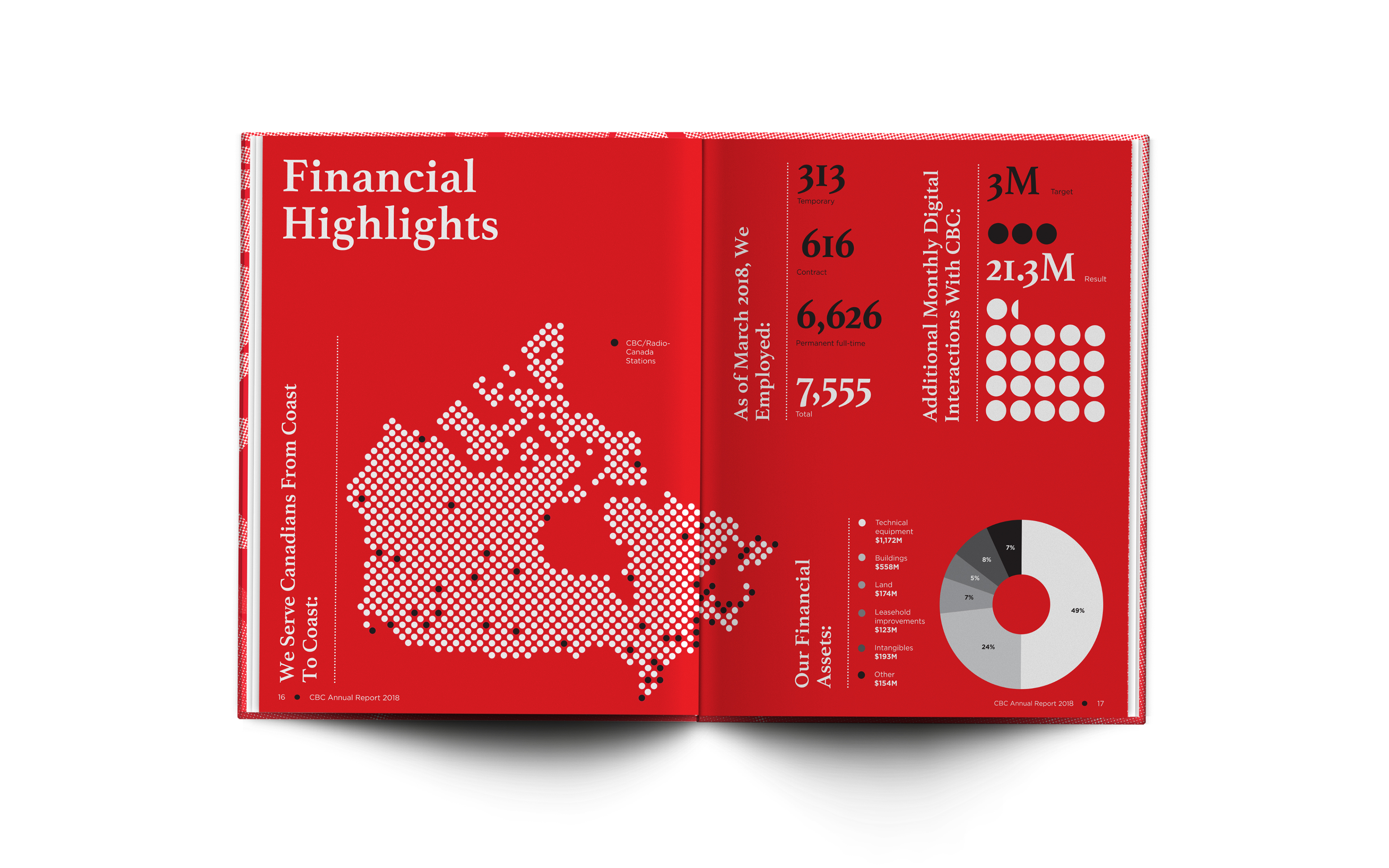 The goal for this Canadian Broadcasting Corporation conceptual annual report was to show shareholders a modern take on the classic Canadian company. To balance the CBC’s conservative, universal appeal with their future-facing outlook, I paired a monochromatic colour scheme with strong but simple typography. Asymmetrical layout elements lend a sense of innovation to the clean overall look of the document, and cropping certain elements off the page gives it motion and a touch of playfulness.